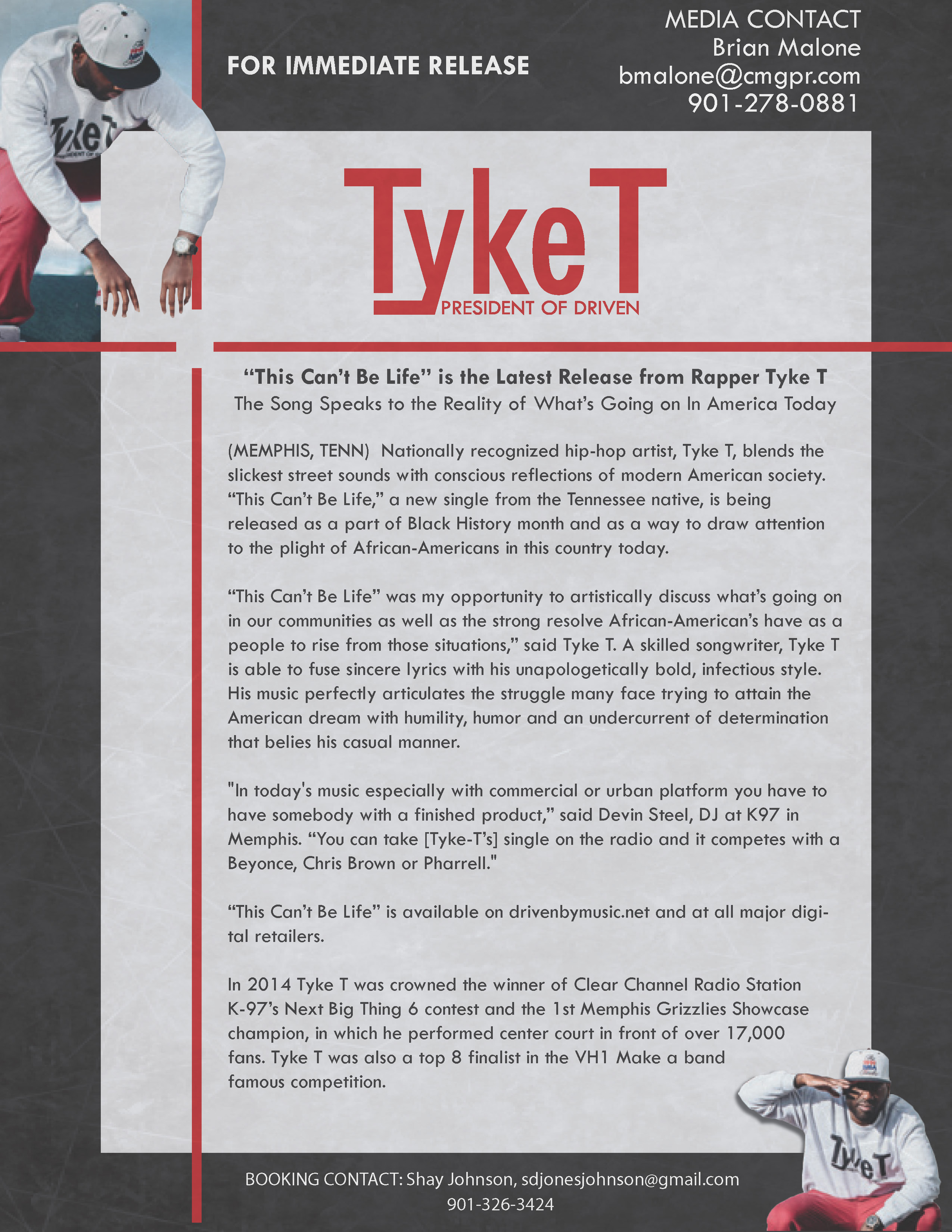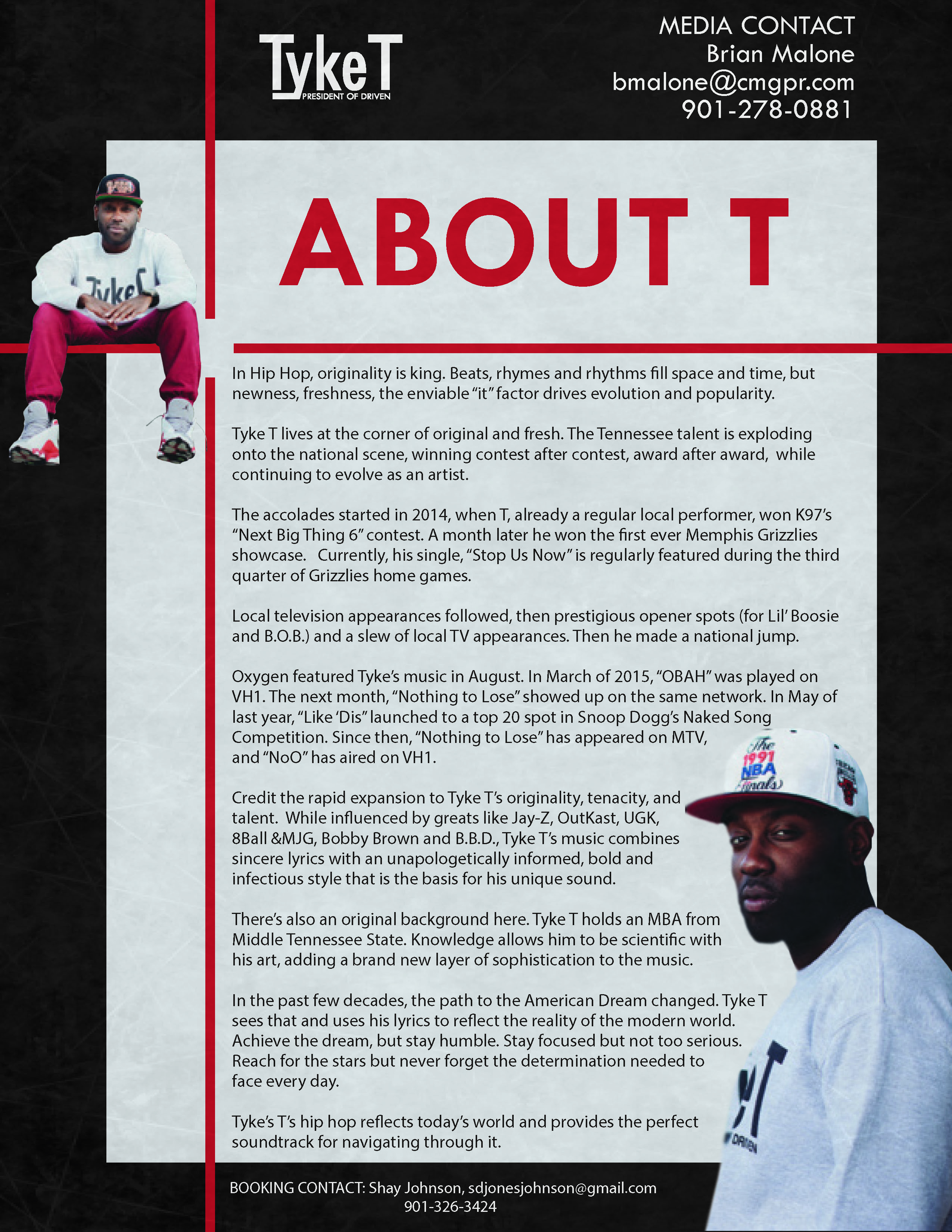 Tyke-T has had some success with his music, but had not been profiled on this scale with some of the major Hip-Hop magazines. We were able secure placements locally in the Commercial Appeal (Daily newspaper), The Tri-State Defender (African-American weekly newspaper), and the Tennessee Tribune (weekly Nashville newspaper) among other placements. The total media impressions for this media kit include during the time period was 1,437,000. There were 29,500 social media views on Facebook for the video and song.